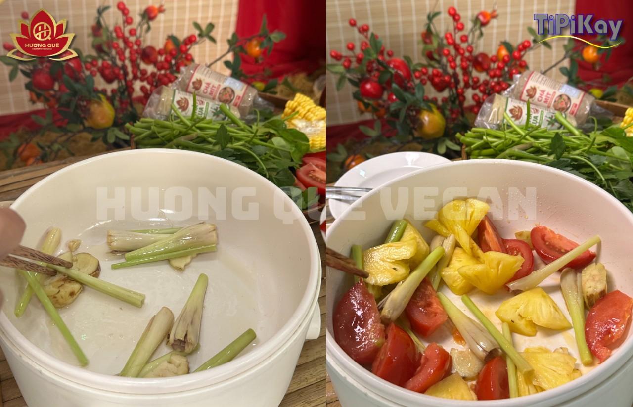Phi củ riềng, thơm, lá chanh, sả, cà chua cho dậy mùi. Khi mùi thơm nồng nàn bốc lên, cho 1,5l nước lọc nấu cùng với nấm hương khô và bắp mỹ.